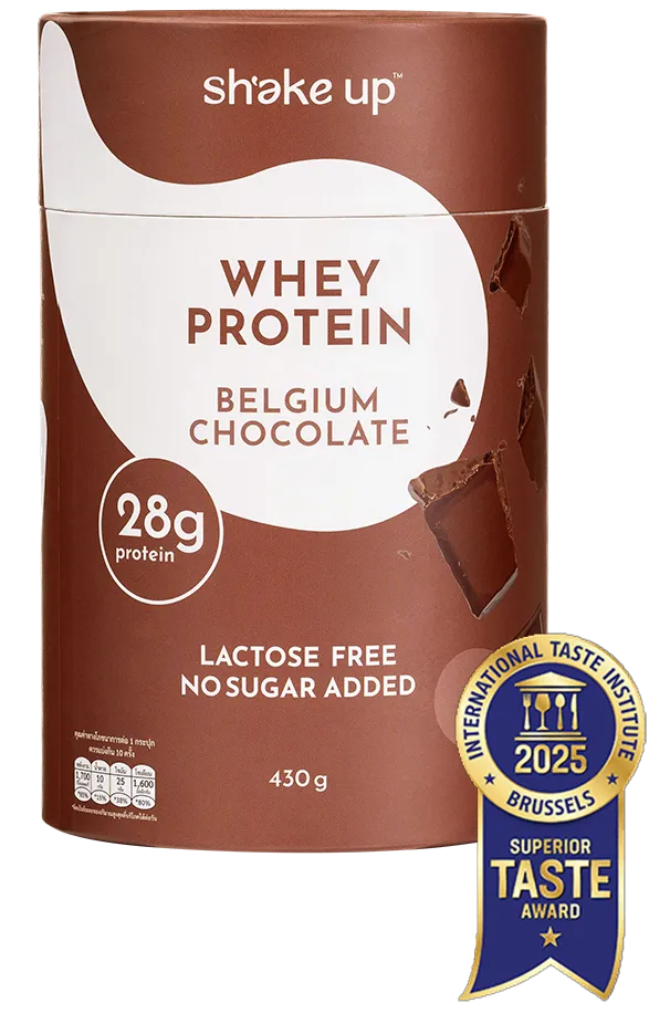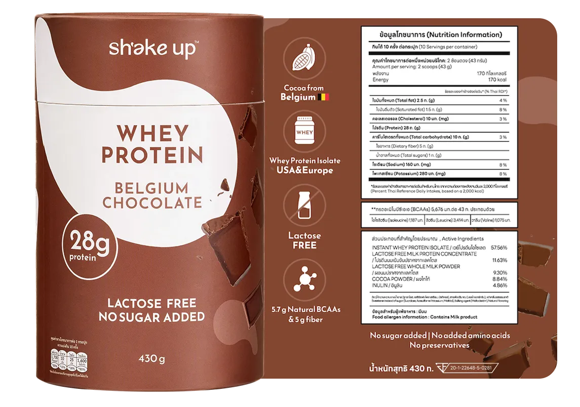 - สัมผัสกับเวย์โปรตีน แลคโตสฟรี รสเบลเยี่ยมช็อกโกแลต โปรตีนสูง 28 กรัม